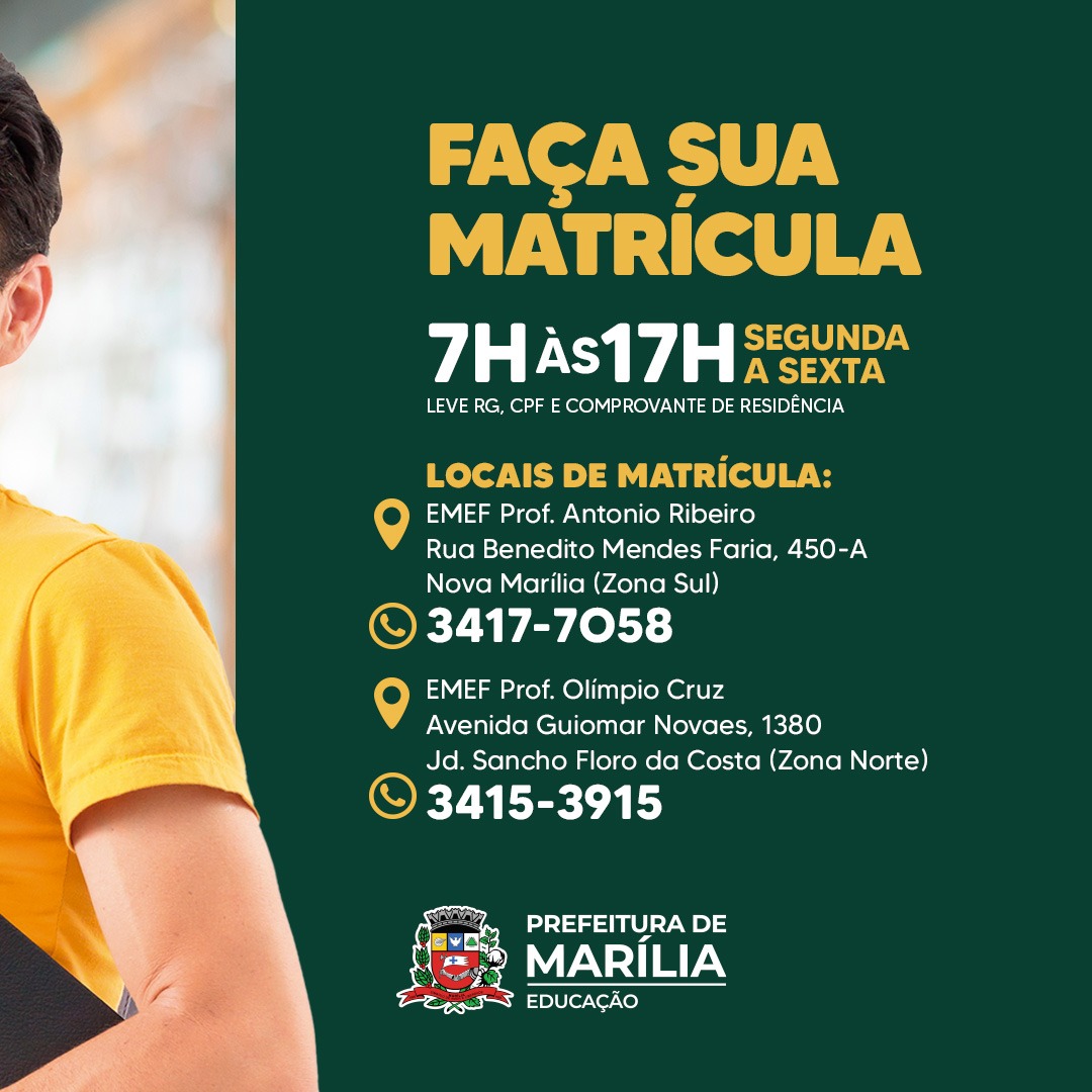Realize sua matrícula de segunda a sexta-feira, das 7h às 17h em uma das Escolas Polos que integram o Sistema Municipal de Ensino de Marília: